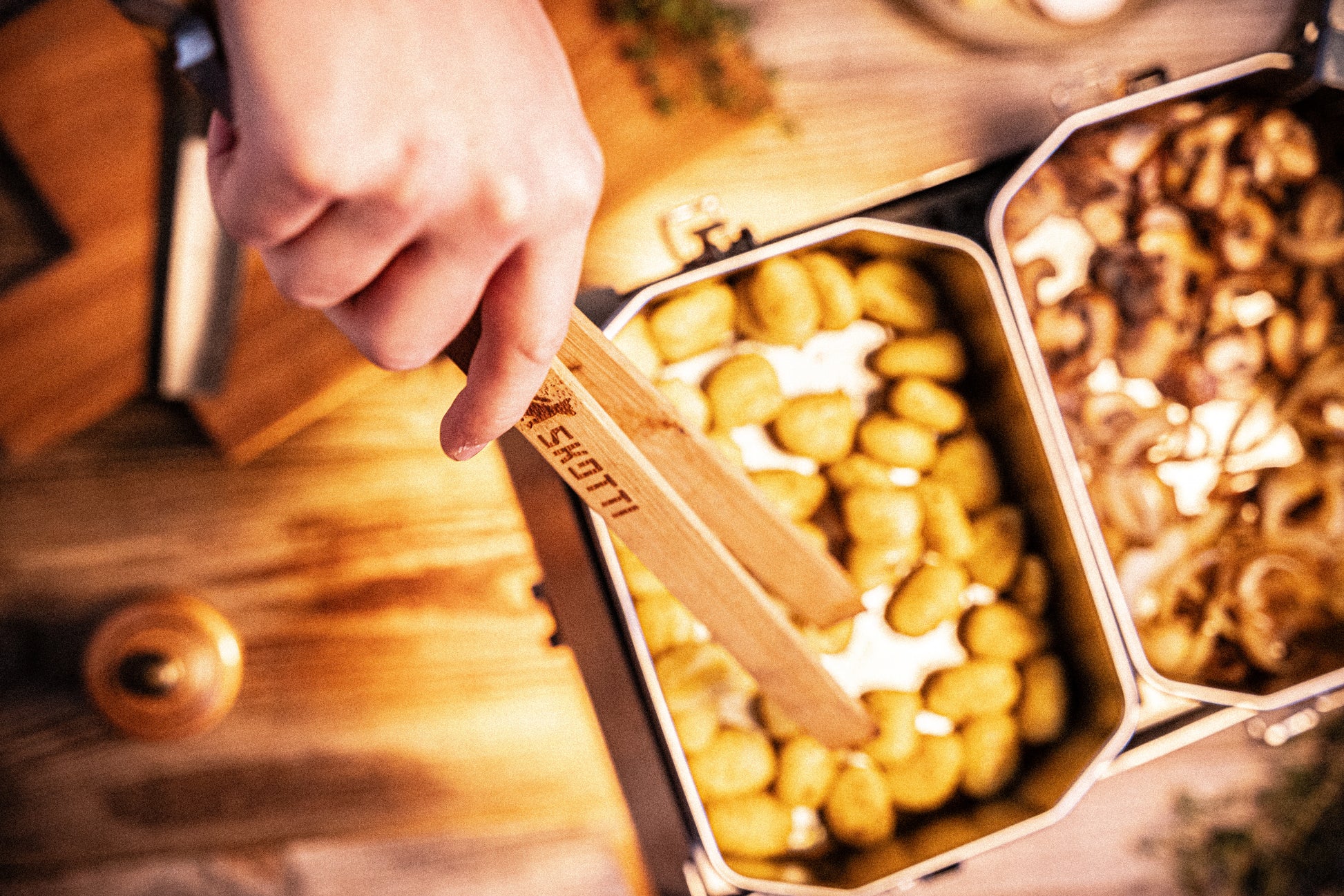 The grill tongs for your SKOTTI Grill can be dismantled just like everything else from SKOTTI and are made of sturdy bamboo wood and high-quality aluminium. For your convenience, they function as a bottle opener too.
